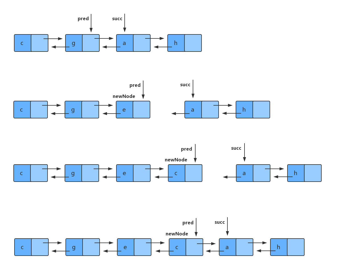 // 新建节点 newNode,前置指针指向 pred,后置指针指向 succ