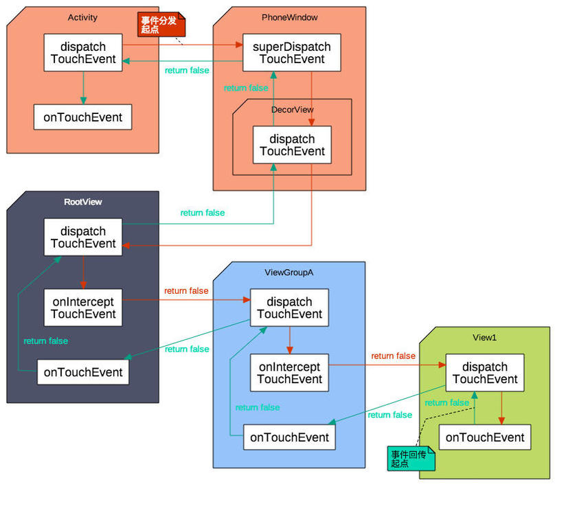事件返回时 dispatchTouchEvent 直接指向了父View的 onTouchEvent 这一部分是不合理的,实际上它仅仅是给了父View的 dispatchTouchEvent 一个 false 返回值,父View根据返回值来调用自身的 onTouchEvent。 ViewGroup 是根据 onInterceptTouchEvent 的返回值来确定是调用子View的 dispatchTouchEvent 还是自身的 onTouchEvent, 并没有将调用交给 onInterceptTouchEvent。