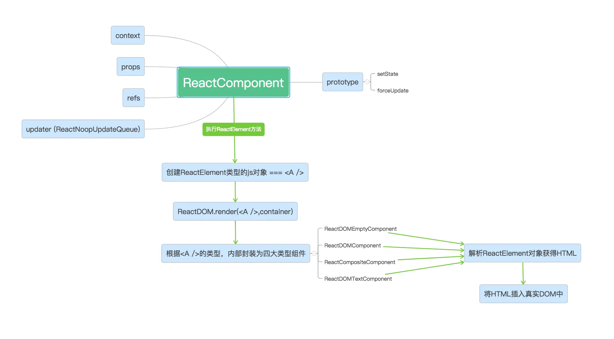 - 1 React.render 作为入口接受一个 React 元素和游览器中的 dom 负责调用渲染,nextReactRootIndex 为每个 component 的唯一标识
