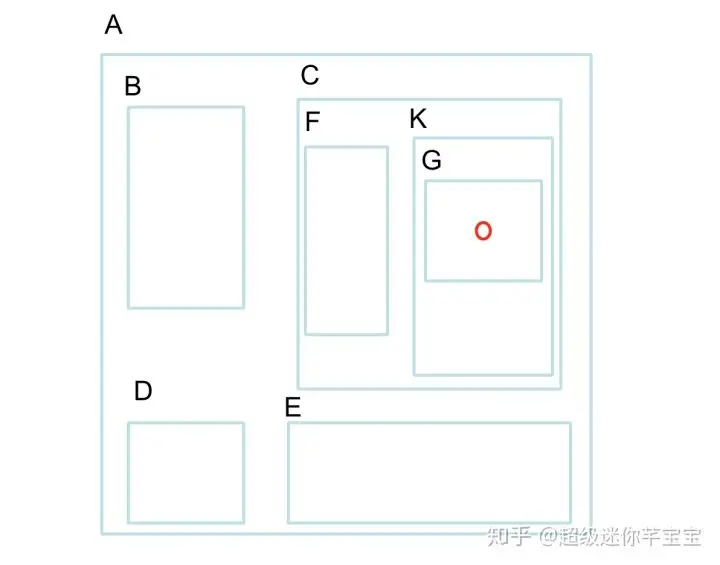 下面示例表示屏幕window由ABCDEFKG视图组成,其中A视图是根视图,即是最底下的视图。红圈表示触摸点位置,触摸落在G视图的中间位置。