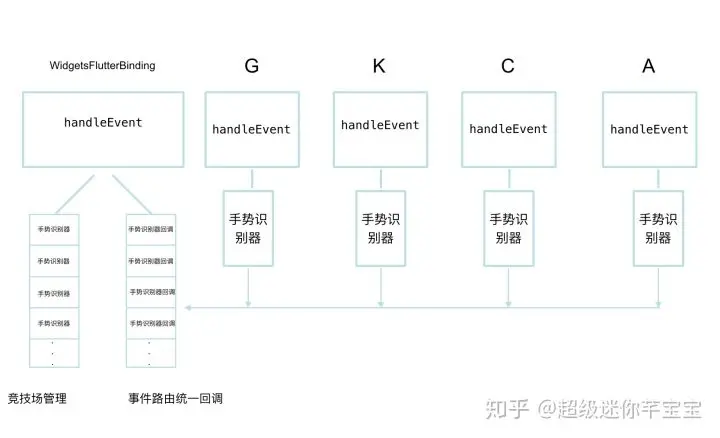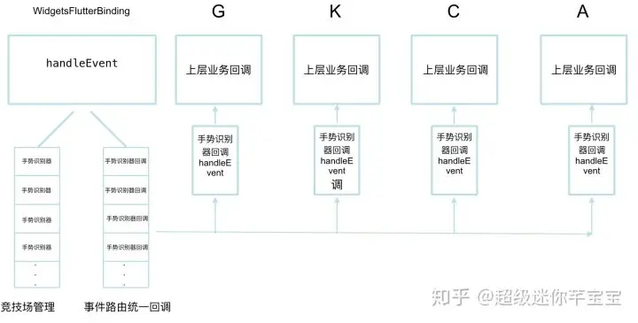 按G->K->C->A->WidgetsFlutterBinding顺序分别调用handleEvent()方法,最后通过WidgetsFlutterBinding调用自己的handleEvent()接口来统一决议最终哪个手势识别器胜出。
