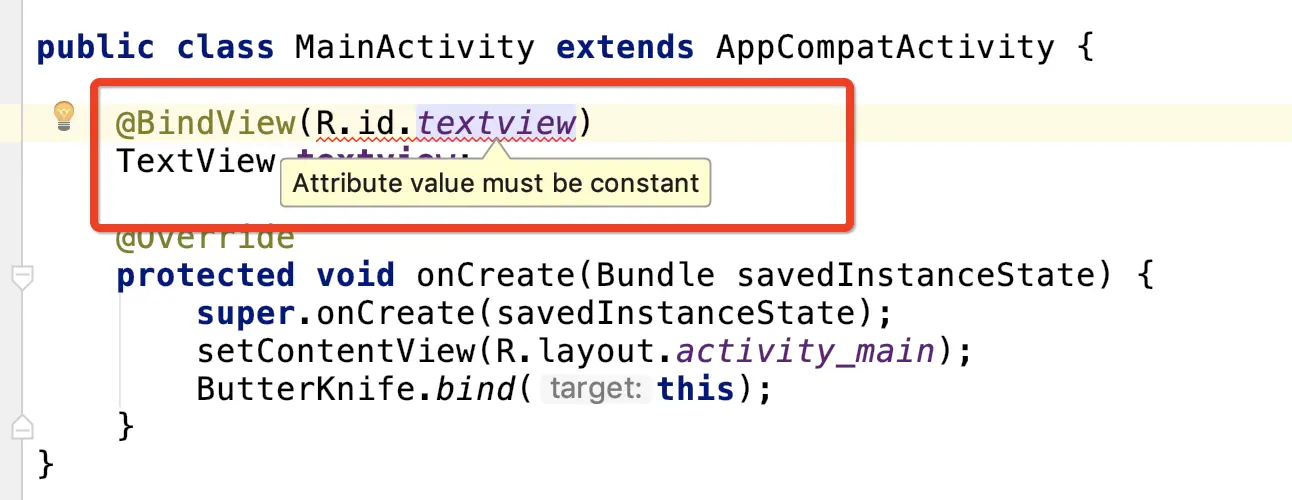 当我们在 library 工程中这样使用 BindView(R.id.textview) 是会报错的,提示如下图所示,表示注解中的值需要接收的是一个
