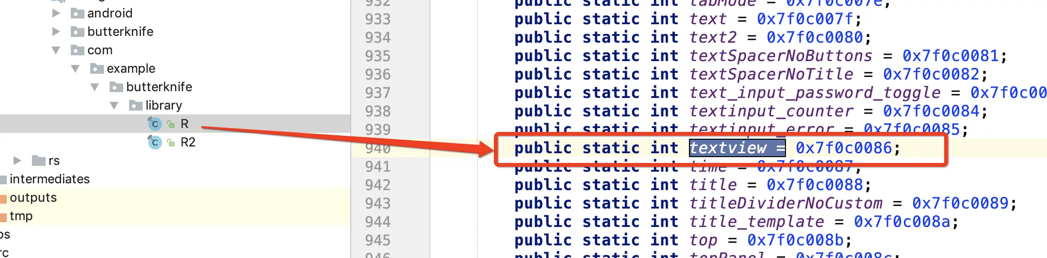 我们来看看在 library 工程中生成的 R.java 文件,可以看出,R.java 类内部都是变量,而不像是 application 工程生成的 R.java 类的变量会被 final 修饰。现在我们就明白了为什么在 library 中这样使用 @BindView(R.id.textview) 会报错。