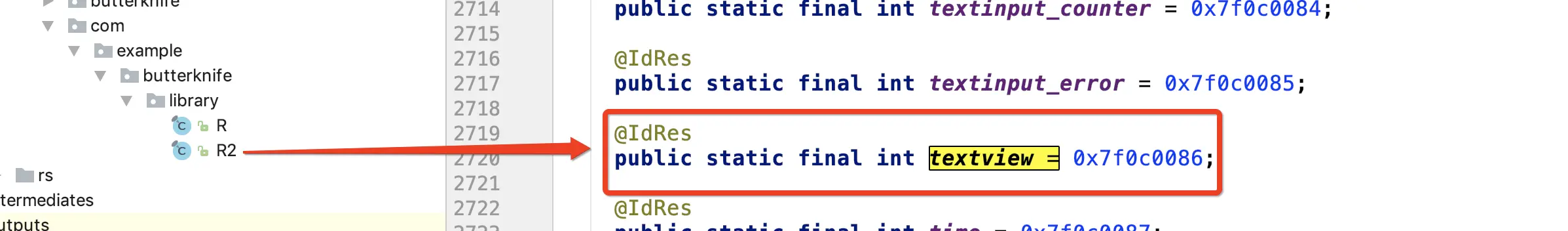 实现的原理就是将 R.java 文件拷贝一份到 R2.java 中,并且将每一个属性变成常量,这样最终就变成 @BindView(R2.id.textview) 了。