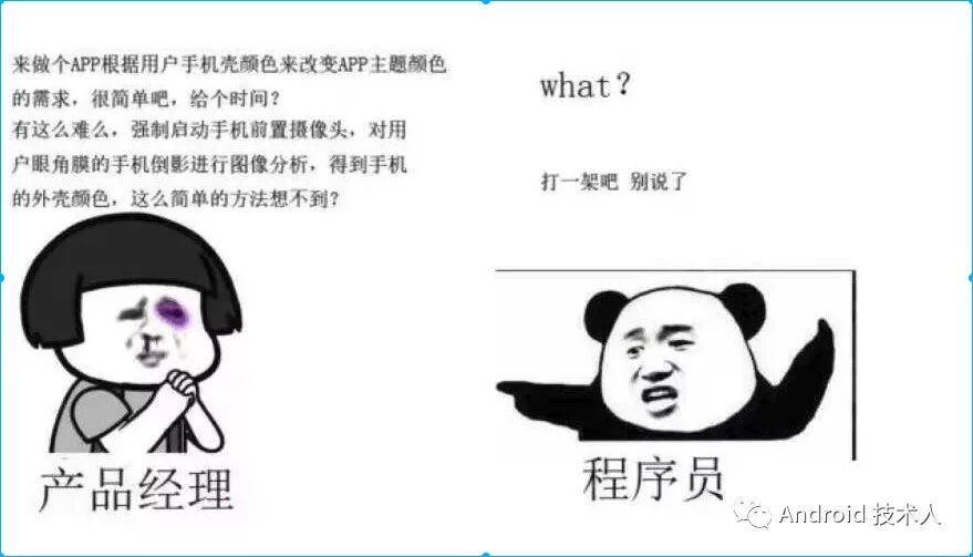 还记得去年“网传中国平安产品经理与开发因「根据手机壳颜色改变app主题」需求打架一事”吧,可以确定的是肯定不是因为该需求干架的,这只是一个导火索。但不可否认的是,程序员或多或少与产品经理存在着某些矛盾。