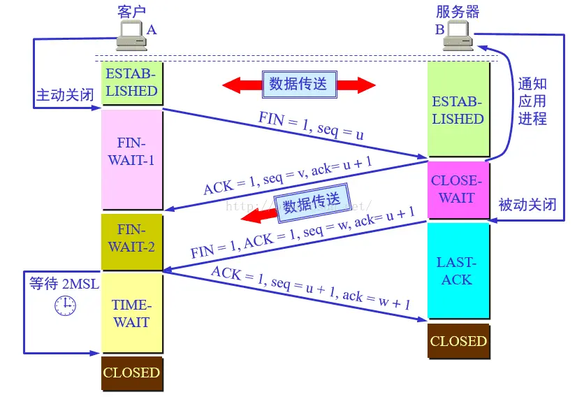 在这个过程中,通信双方的状态如下图,其中:ESTAB-LISHED:连接建立状态、FIN-WAIT-1:终止等待1状态、FIN-WAIT-2:终止等待2状态、CLOSE-WAIT:关闭等待状态、LAST-ACK:最后确认状态、TIME-WAIT:时间等待状态、CLOSED:关闭状态