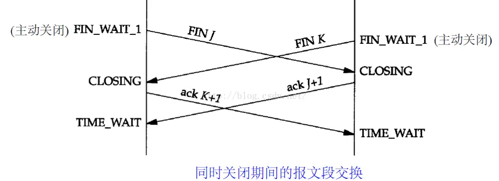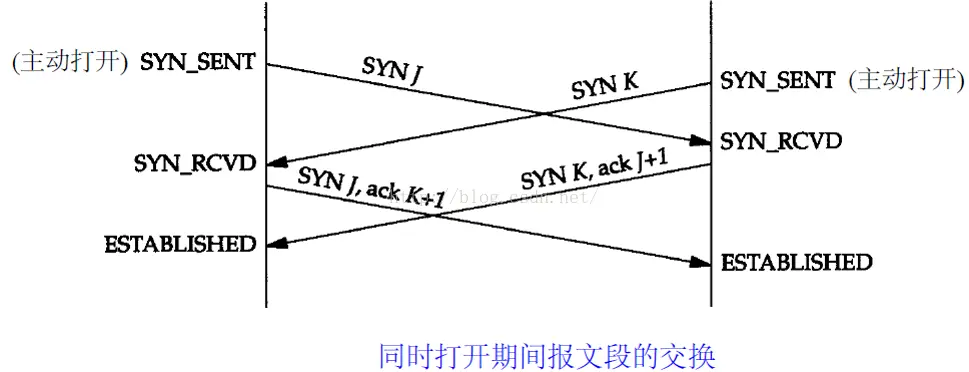 这种情况虽然发生的可能性极小,但是是确实存在的,TCP也特意设计了相关机制,使得在这种情况下双方仅建立一条连接。双方同时请求连接的情况下,双方同时发出请求连接报文,并进入SYN-SENT状态;当收到对方的请求连接报文后,会再次发送请求连接报文,确认号为对方的SYN+1,并进入SYN-RCVD状态;当收到对方第二次发出的携带确认号的请求报文之后,会进入ESTAB-LISHED状态。 双方同时请求释放连接也是同样的,双方同时发出连接释放报文,并进入FIN-WAIT-1状态;在收到对方的报文之后,发送确认报文,并进入CLOSING状态;在收到对方的确认报文后,进入TIME-WAIT状态,等待2MSL之后关闭连接。需要注意的是,这个时候虽然不用再次发送确认报文并确认对方收到,双方仍需等待2MSL之后再关闭连接,是为了防止“已失效的连接请求报文段”的影响。 过程图如下: