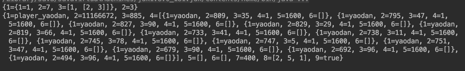 System.out.println(judger.enClass("{player_yaodan,11166672,885,[{yaodan,809,35,1,1600,[]},{yaodan,795,47,1,1600,[]},{yaodan,827,90,1,1600,[]},{yaodan,829,29,1,1600,[]},{yaodan,819,66,1,1600,[]},{yaodan,733,41,1,1600,[]},{yaodan,738,11,1,1600,[]},{yaodan,745,78,1,1600,[]},{yaodan,747,5,1,1600,[]},{yaodan,751,47,1,1600,[]},{yaodan,679,90,1,1600,[]},{yaodan,692,96,1,1600,[]},{yaodan,494,96,1,1600,[]}],[],[],400,[2,5,1],true}"));
