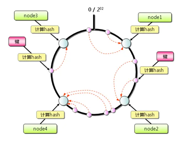通常的一致性哈希做法是将 value 映射到一个 32 位的 key 值,也即是 0~2^32-1 次方的数值空间;我们可以将这个空间想象成一个首( 0 )尾( 2^32-1 )相接的圆环。