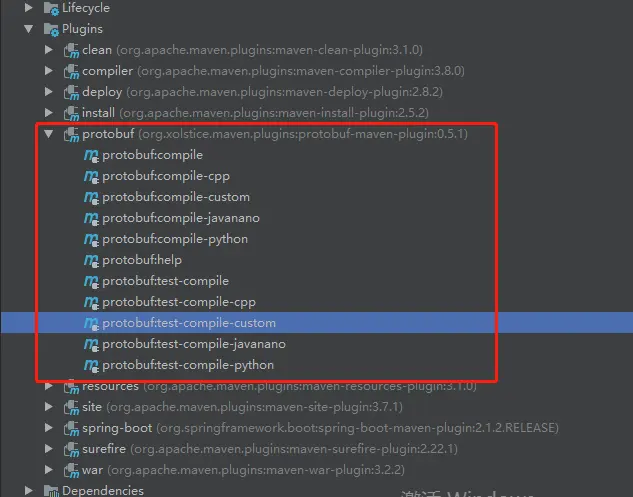 </plugins>引入后,在idea中maven projects中的plugins中就会看到protobuf,在这个里面就能生成所需要的java文件。到“lifecycle”中执行compile或者执行maven命令“mvn compile”,就能生成需要的java文件。