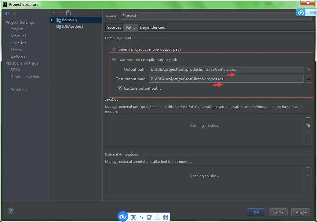 选择 Paths -> 选择"Use module compile output path" -> 将Output path和Test output path都选择刚刚创建的classes文件夹。