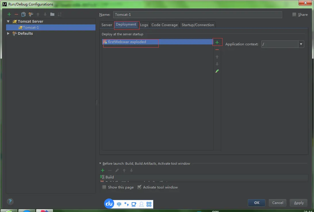 Run -> Edit Configurations,进入"Run/Debug Configurations"窗口 -> 选择刚刚建立的Tomcat容器 -> 选择Deployment -> 点击右边的“+”号 -> 选择Artifact