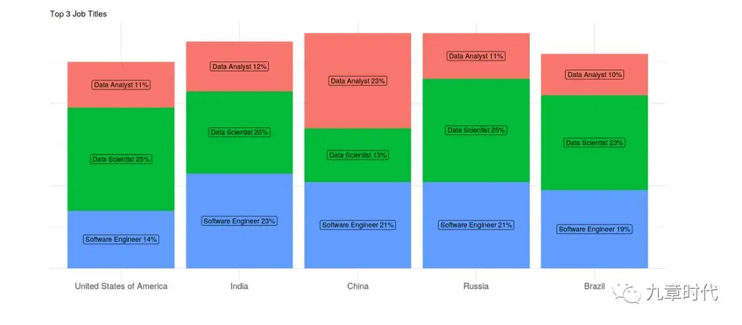 在中国,数据分析师占比最大,数据工程师紧随其后。数据科学家占比较小,但相比去年还是有显著增加。