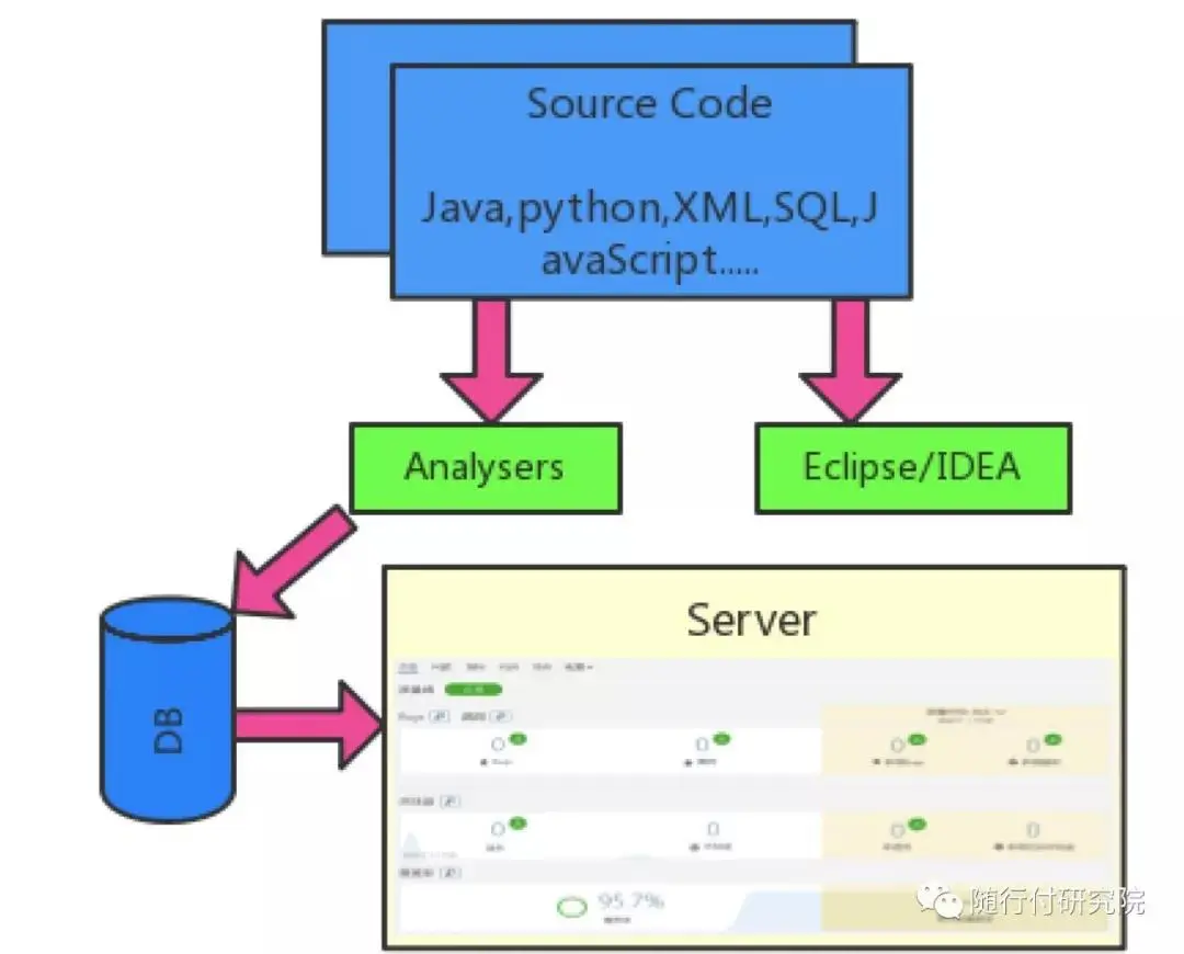 SonarQube是一个用于代码质量管理的开源平台,支持25+种编程语言的质量扫描。SonqrQube由远程机、Server端和数据库构成。远程客户机可以通过各种不同的分析机制,从而将被分析的项目代码上传到SonarQube server 并进行代码质量的管理和分析,SonarQube 还会通过Web API将分析的结果以可视化、可度量的方式展示给出来。逻辑结构如下图所示: