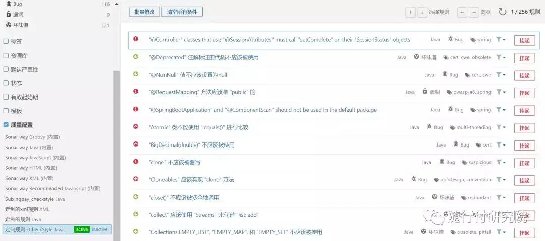 考虑到Sonar Java规则已经包含了PMD和CheckStyle规则,因此我们选择了Sonar的默认规则,并对其进行了定制化。下图中SonarQube中展示了部分定制化规则内容。