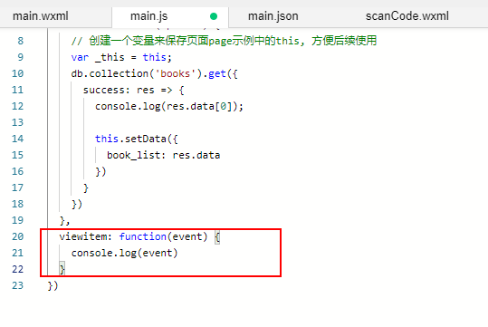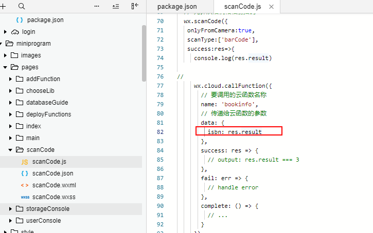5:代码逻辑 1:点击按钮之后调用扫一扫scanCode 2:读取照相机传递过来的图片,拿到barCode的代码 3:将拿到的barCode代码传递给云函数中的bookinfo,传递后将结果获取到本地 4:用云数据库的示例去创建新的字段添加到数据库之中