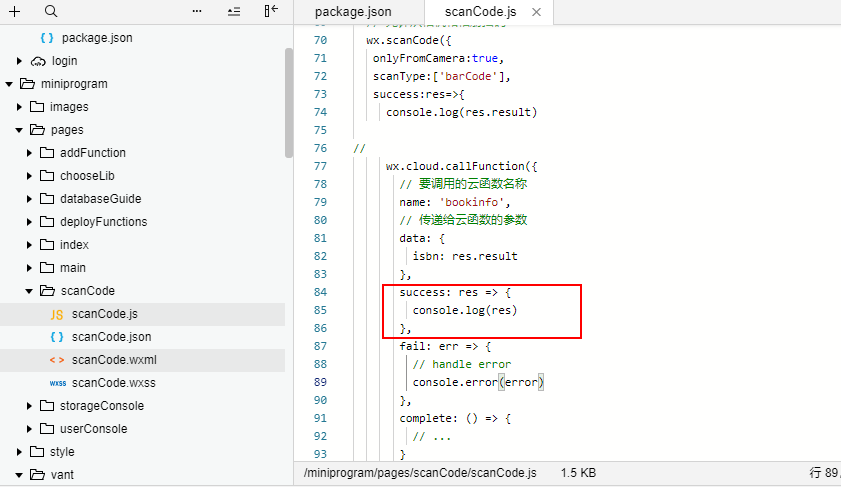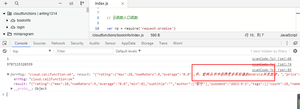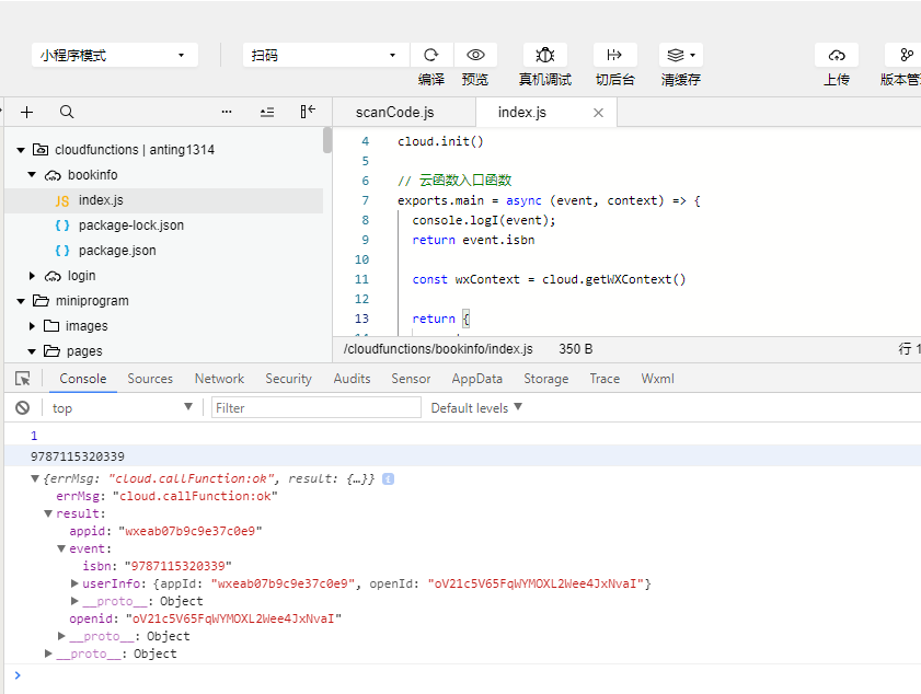 打开bookinfo里面的index.js,将event结果打印出来,请求云函数,将云函数之中的isbn返回回来