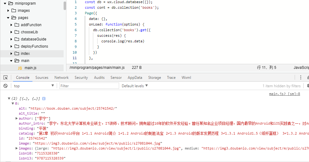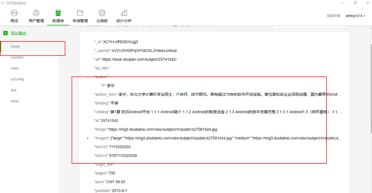 6:测试一下,好了,小程序端获取的豆瓣API数据存入云数据库里面了。