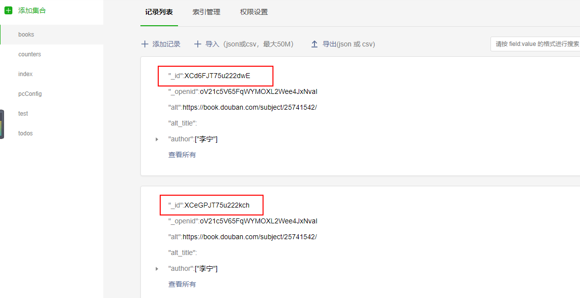 4:如何知道要跳转列表图书中的哪个详情页?要在云开发里面写一个特定的id,打开云开发控制台,数据库,需要用到这个下划线是_id的字段