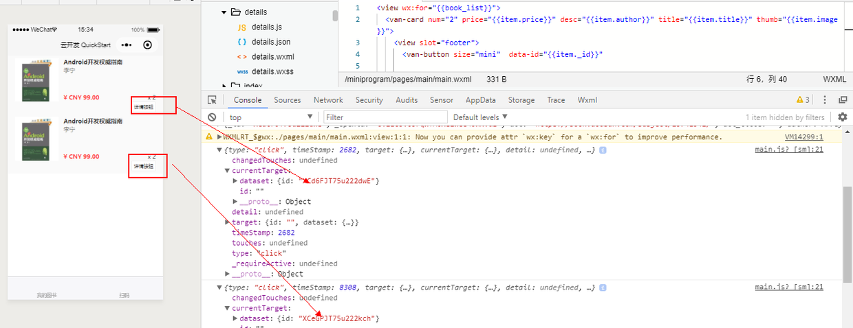 6:下面实现点击详情按钮跳转详情页面,看到想要的具体的内容,看完控制台,因为具体数据是来自于event,currentTarget