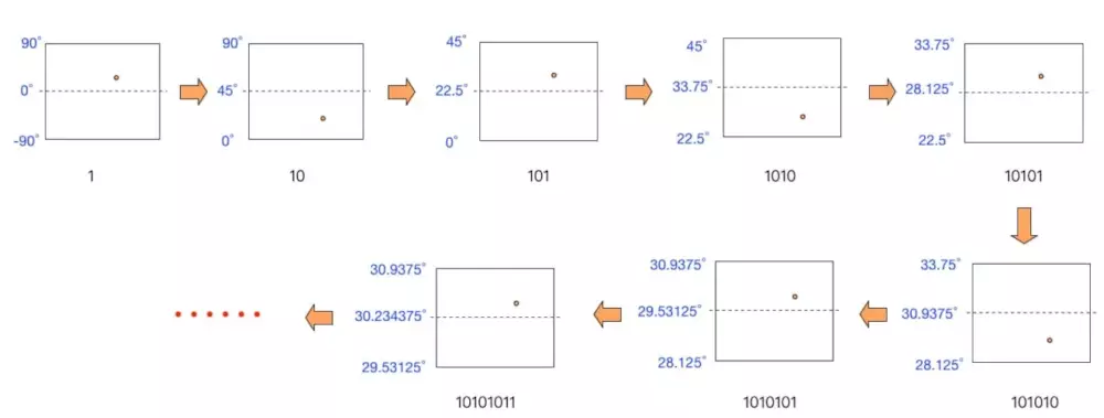 以坐标“30.280245, 120.027162”为例,计算其GeoHash字符串。首先对纬度做二进制编码: