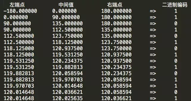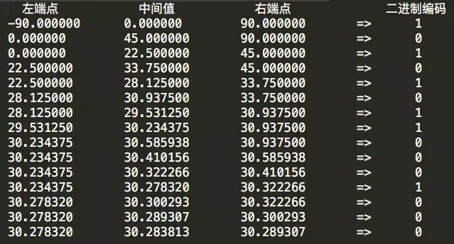 按照上面的流程,继续往下迭代,直到编码位数达到我们业务对精度的需求为止。完整的15位二进制编码迭代表格如下: