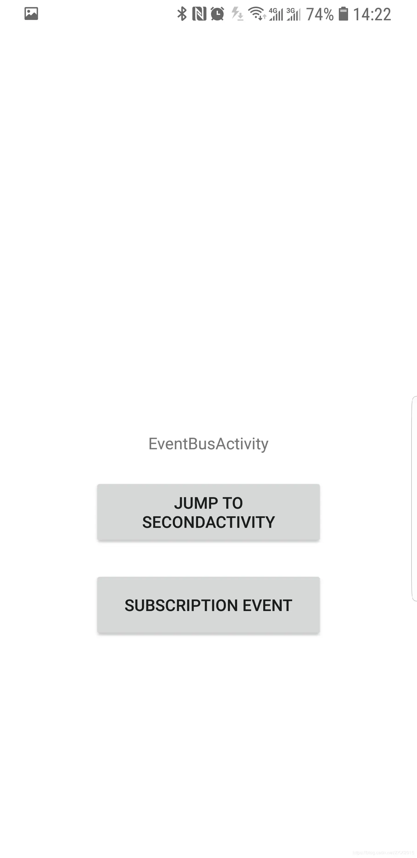 主页,显示EventBusActivity,我们首先订阅事件。然后跳转到SecondActivity发送事件。