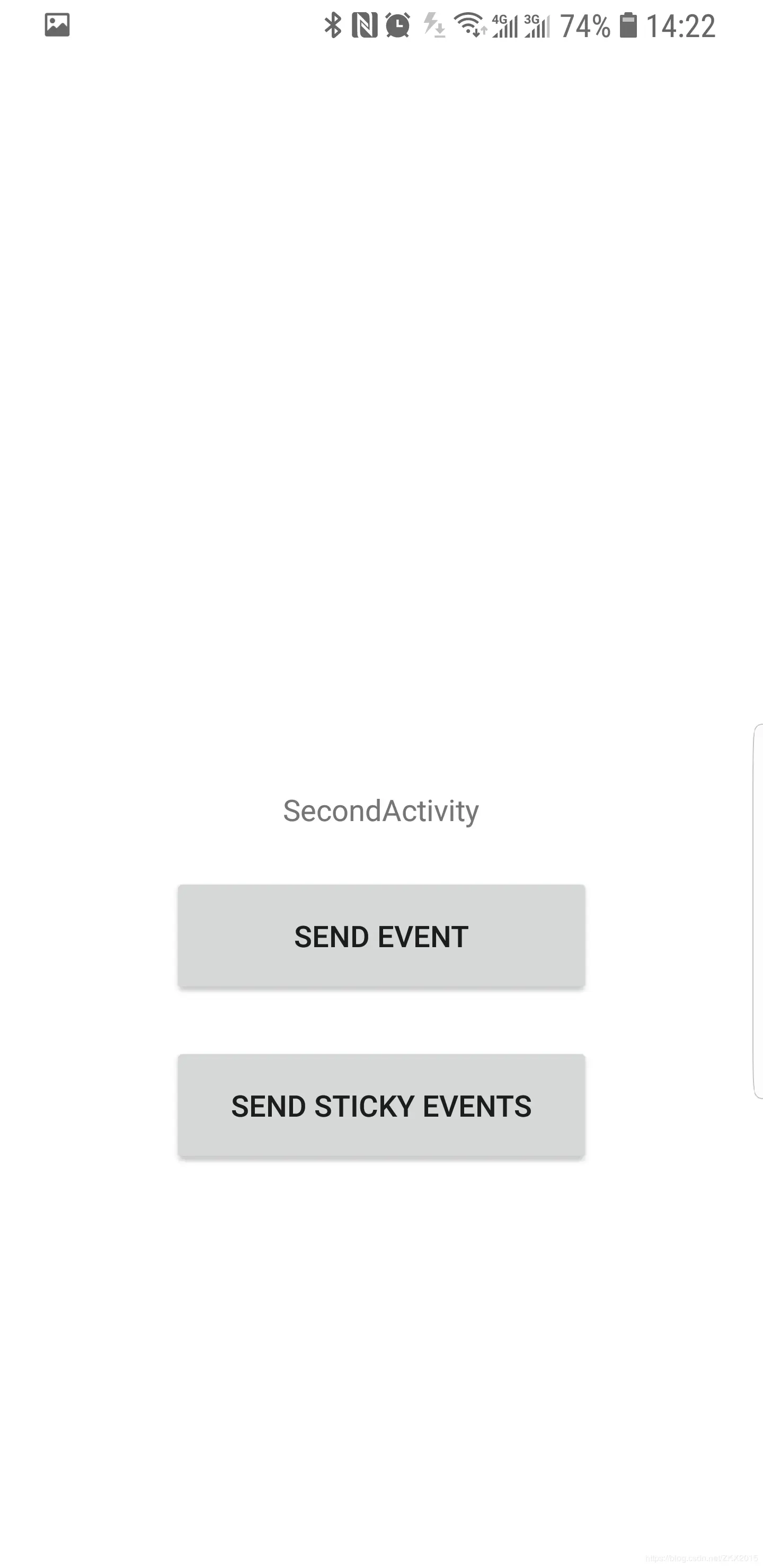 接下来测试粘性事件,首先我们先不订阅事件,先跳转到SecondActivity,点击发送粘性事件。然后我们发现字样并没有变化。