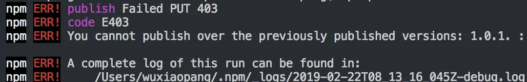 npm publish命令就ok, 注意需要修改package.json的version大于当前版本即可,否则会报错。如下: