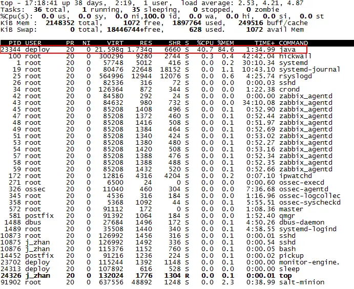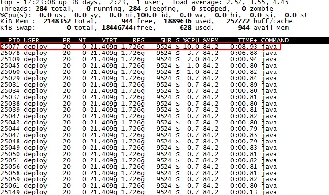 1、上图中可以看出pid为23344的java进程占用了较多的cpu资源;