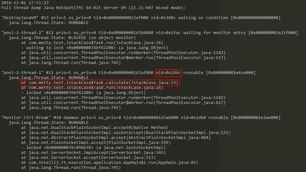 在top命令中,已经获取到了占用cpu资源较高的线程pid,将该pid转成16进制的值,在thread dump中每个线程都有一个nid,找到对应的nid即可;隔段时间再执行一次stack命令获取thread dump,区分两份dump是否有差别,在nid=0x246c的线程调用栈中,发现该线程一直在执行JstackCase类第33行的calculate方法,得到这个信息,就可以检查对应的代码是否有问题。