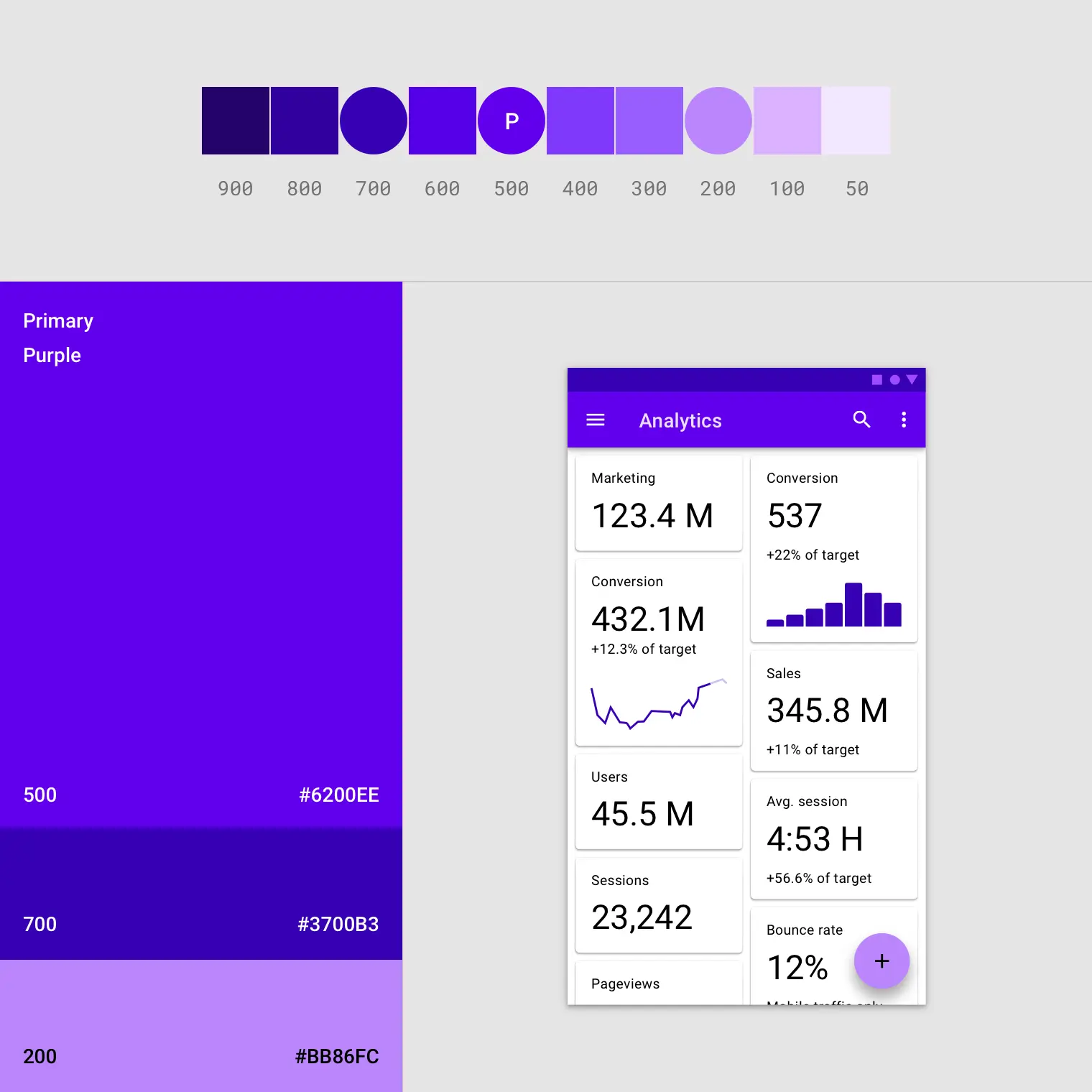 Material Design颜色系统使用有规律的方法将颜色运用到UI中。在这个系统里,通常会选择一个主色和一个辅助色来代表品牌,每个颜色的深浅衍生色也能在UI中通过不同的方式来使用。