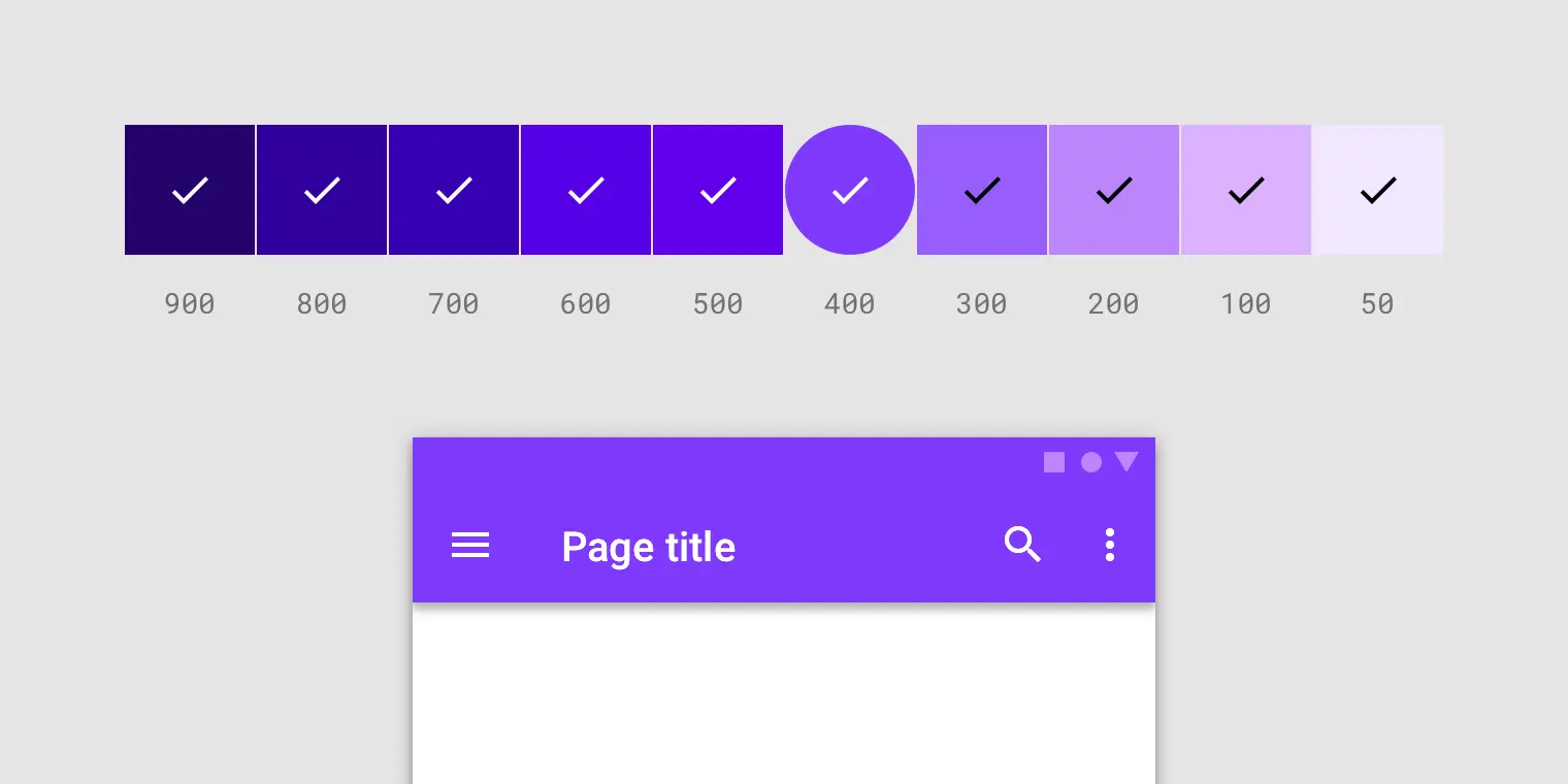 应用程序内的元素选用调色板中的特定颜色(例如主色)。当其它界面中的元素(例如文本或图标)出现在有特定颜色的表面上时,这些元素应选用专门设计的颜色,使之与其背后的颜色形成对比并让内容清晰可读。