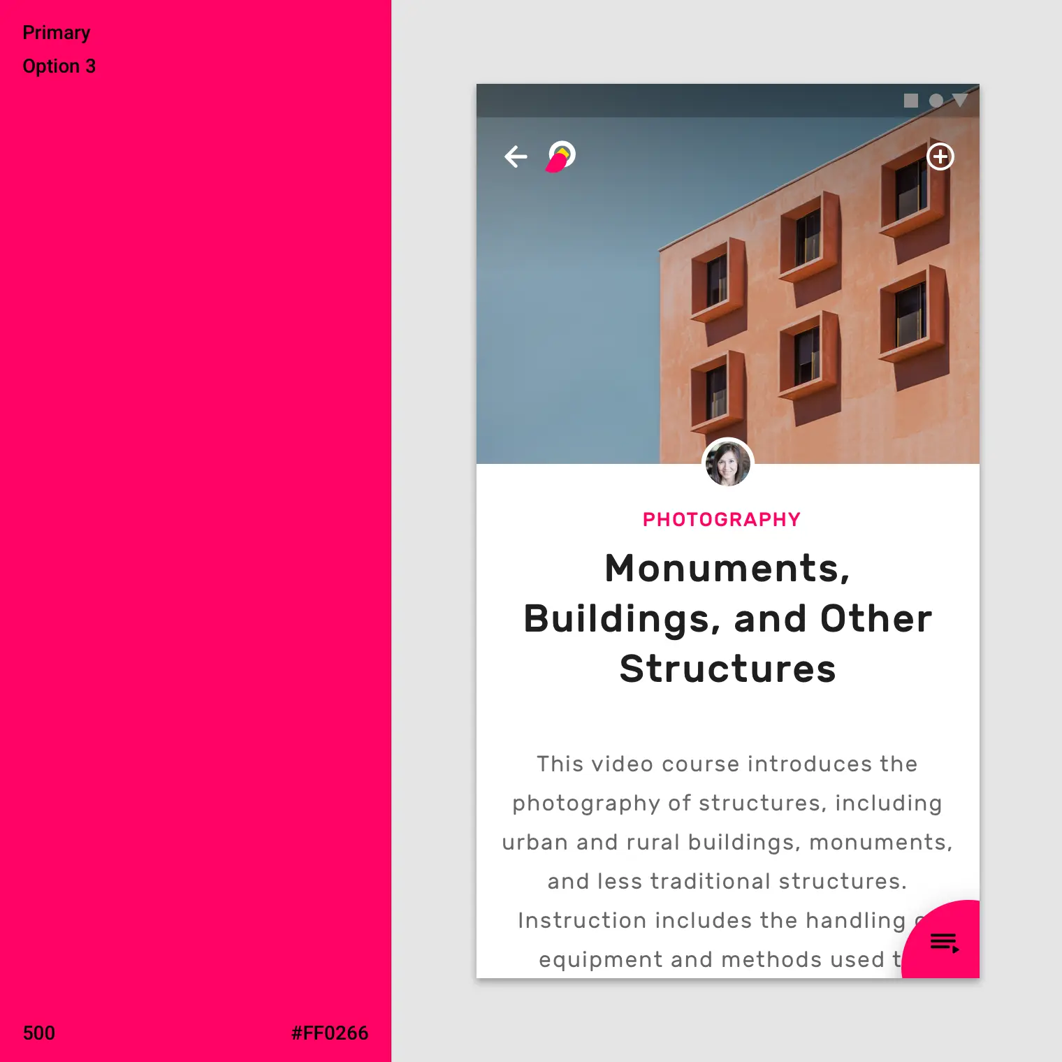 为了使UI元素间形成对比,例如区分顶部应用栏和系统栏,可以在两个元素上应用不同明度的主色衍生色。你也可以使用衍生色来区分组件,例如将不同的衍生色分别用于浮动操作按钮的容器和其内部的图标。