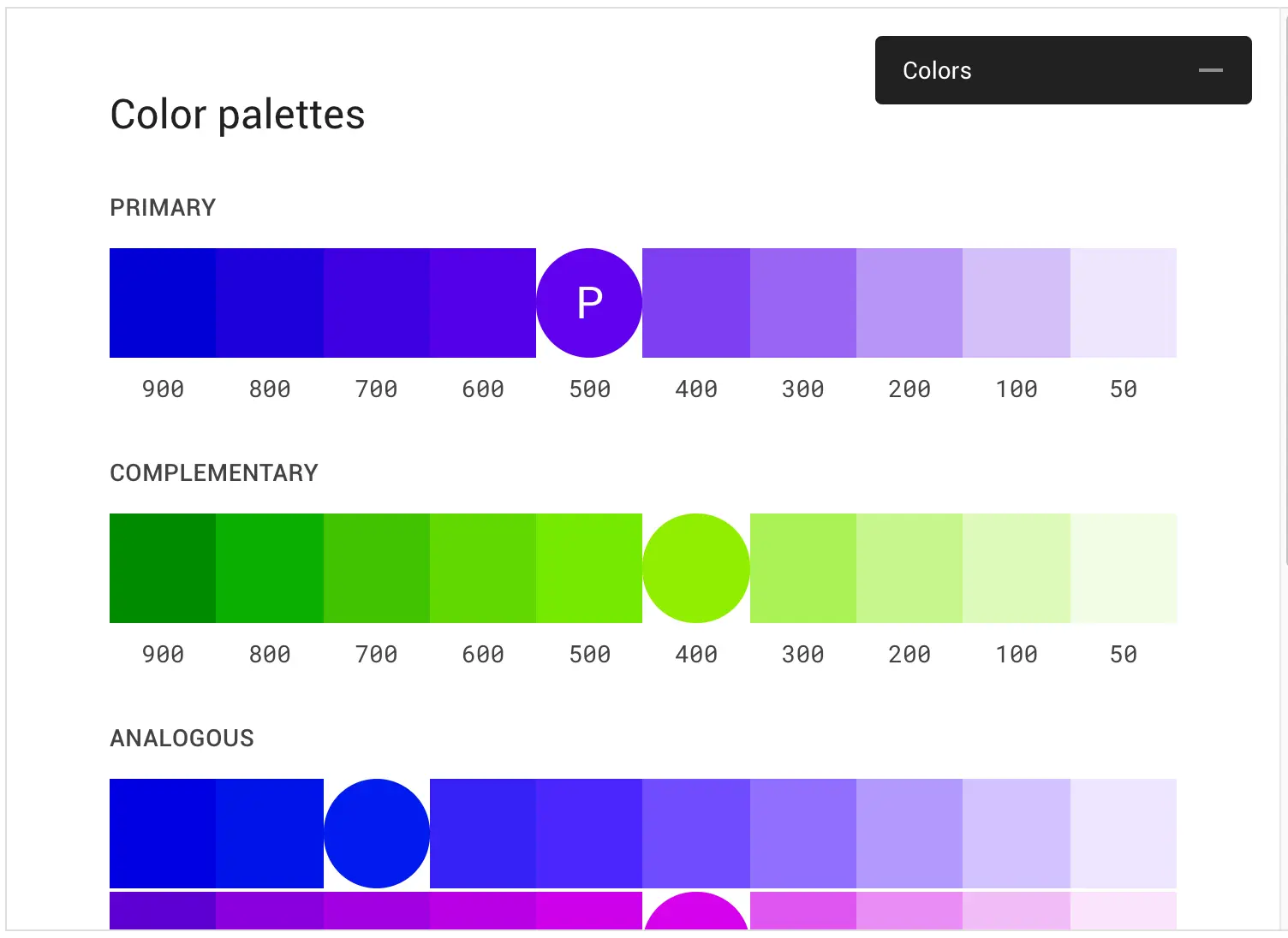 这些调色板提供了使用主色和辅助色的附加方法,通过给出更浅或更深的选项来区分界面以及提供符合可访问标准的颜色。