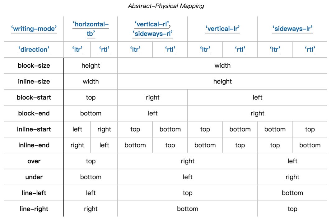 特别说明,逻辑属性具体映射到哪个物理属性上,这取决于元素自身的书写模式。书写模式是由这三个属性 writing-mode, direction和text-orientation 共同决定的,详见 CSS Writing Modes Level 4。