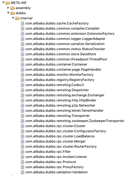 Dubbo SPI 的相关逻辑被封装在了 ExtensionLoader 类中,通过 ExtensionLoader,我们可以加载指定的实现类。Dubbo SPI 所需的配置文件需放置在 META-INF/dubbo 路径下,文件名是扩展接口的全限定名。例如com.alibaba.dubbo.rpc.Filter的文件名就是com.alibaba.dubbo.rpc.Filter。