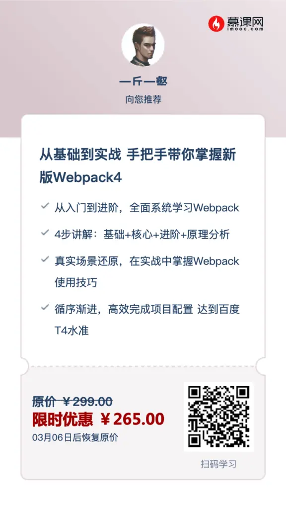 就像前文说的,如果你只是出于兴趣想在个人项目中玩玩 Vue + WordPress,那么其实用过不到Webpack等一系列的重型武器,直接引入Vue.js 就可以,即使用了也不用钻的太深,基本上直接引用Vue提供的官方配置就行了。如果你想在前端开发水平上一个层次,后者在公司项目里使用,那么绝对要学好Webpack了。 Webpack 目前无论在求职还是工作中,使用越来越普及。而想要学懂,学会Webpack更绝非易事。推荐你慕课网这门课,《从基础到实战 手把手带你掌握新版Webpack4》,融合技能+项目+思想 讲解前端开发必学的Webpack,值得花钱好好学一下。本课程完整讲清最新版本下的 Webpack 4 知识体系,通过 基础 + 实例 + 原理代码编写 + 复杂案例分析 完成Webpack4的分析与讲解。更重要的是让你对整个前端项目的构建有一个全局化的认识,实现能力思想双升级。
