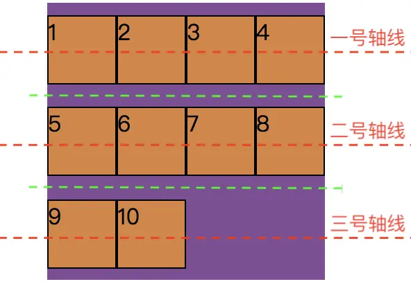 - stretch(默认值):轴线占满整个交叉轴,在多行元素下,各个元素将拉伸充满整个父容器。