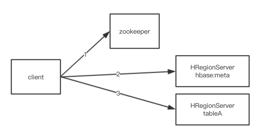 我们以单条 rowkey 的 Get 请求为例,当用户初始化到 zookeeper 的连接之后,并发送一个 Get 请求时,需要先定位这条 rowkey 的 HRegion 地址。如果该地址不在缓存之中,就需要请求 zookeeper (箭头1),询问 meta 表的地址。在获取到 meta 表地址之后去读取 meta 表的数据来根据 rowkey 定位到该 rowkey 属于的 HRegion 信息和 RegionServer 的地址(箭头2),缓存该地址并发 Get 请求点对点发送到对应的 RegionServer(箭头3),至此,客户端定位发送请求的流程走通。
