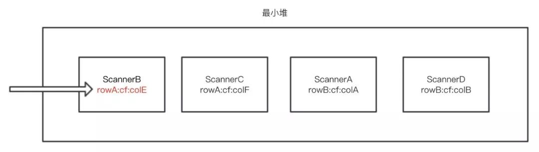 第二次 next 请求,返回 ScannerA 中的 rowA:cf:colB,ScannerA 的 current 指针移动到下一个 KeyValue rowB:cf:ColA,因为堆按照 KeyValue 排序可知 rowB 小于 rowA, 所以堆内部,scanner 顺序发生改变,改变之后如下图所示: