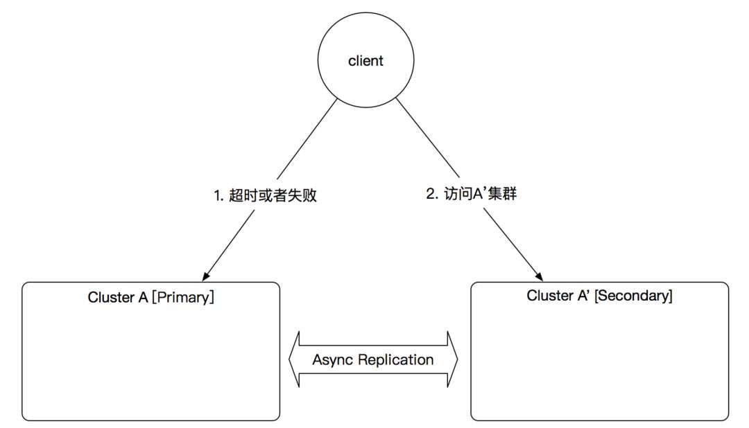 HBase 提供了 HBase Replication 机制,用来实现集群间单方向的异步数据复制我们线上部署了双集群,备集群 SSD 分组和主集群 SSD 分组有相同的配置。当主集群因为磁盘,网络,或者其他业务突发流量影响导致某些 RegionServer 甚至集群不可用的时候,就需要提供备集群继续提供服务,备集群的数据可能会因为 HBase Replication 机制的延迟,相比主集群的数据是滞后的,按照我们集群目前的规模统计,平均延迟在 100ms 以内。所以为了达到高可用,粉丝业务可以接受复制延迟,放弃了强一致性,选择了最终一致性和高可用性,在第一版采用的方案如下: