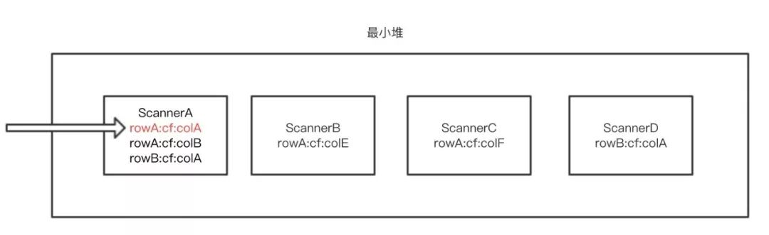 第一次 next 请求,将会返回 ScannerA中的rowA:cf:colA,而后 ScannerA 的指针移动到下一个 KeyValue rowA:cf:colB,堆中的 Scanners 排序不变;