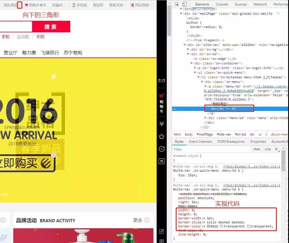 我们打开淘宝天猫,来看下它顶部的下拉菜单,是不是也用到向上的三角形和向下的三角形。