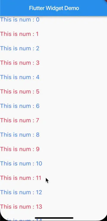 return Text('This is num : $index', style: TextStyle(fontSize: 20, color: index % 2 == 0 ? Colors.blueAccent : Colors.redAccent),);