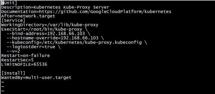 [Unit] Description=Kubernetes Kube-Proxy Server ... [Service] #工作目录 WorkingDirectory=/var/lib/kube-proxy ExecStart=/home/michael/bin/kube-proxy \ #监听地址 --bind-address=192.168.1.103 \ #依赖的配置文件,描述了kube-proxy如何访问api-server --kubeconfig=/etc/kubernetes/kube-proxy.kubeconfig \ ...