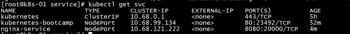 api的时候就建立的一个service,查看类型是Type:ClusterIp,它有一个虚拟的Ip(10.68.0.1)相当于给apiservice做成了一个服务,一个是集群内的其他组件,可以通过这个ip直接进行访问,不需要依赖具体worker的ip地址了,负载均衡,apiserver的高可用,通过apiserver的ip来完成。上次访问对应的deployment,都是启动代理,然后另一个窗口通过curl的方式来进行访问。