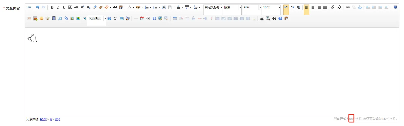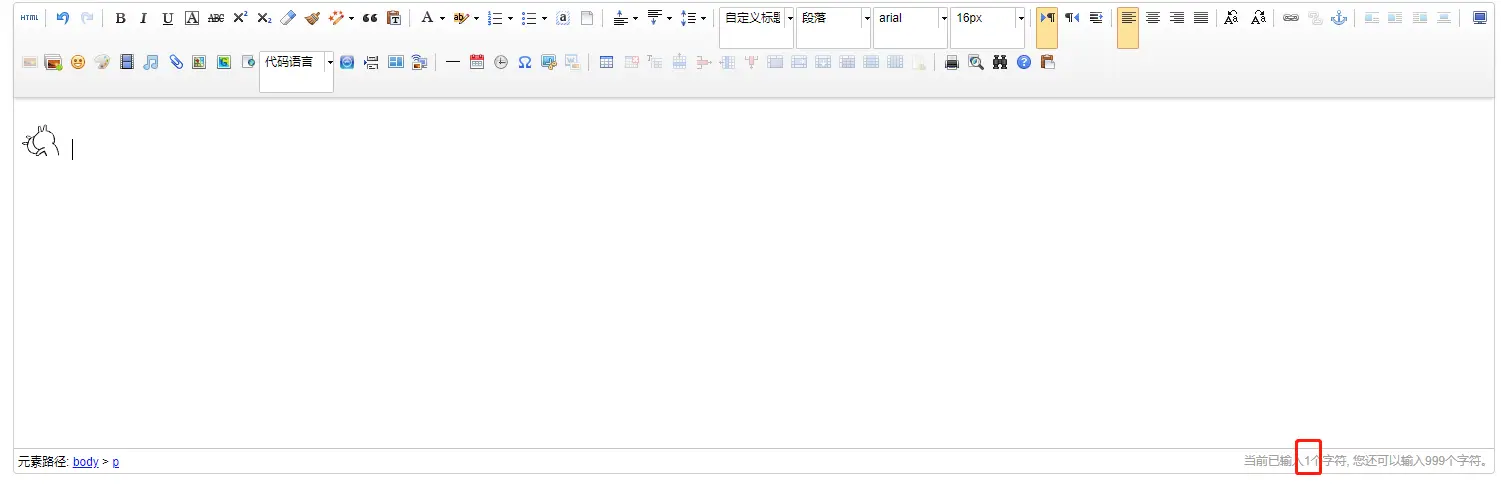 该Ueditor中的内容长度(在这里仅以vue双向绑定为例)都是按照1个字符长度进行计算的,如插入一个表情显示长度为1:
