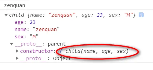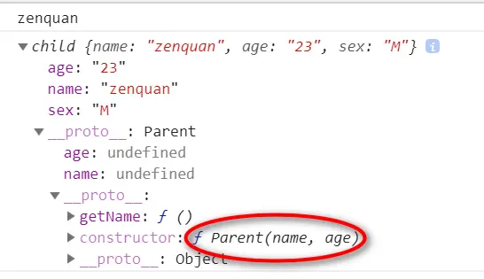var c1 = new child('zenquan', 23, 'M');