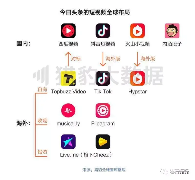 b.今日头条承担了短视频领域的绝大部分流量,对传统的BAT(百度,阿里,腾讯)都产生了巨大的冲击。可以看一下今日头条对短视频的布局(见下图),势必会遭到遏制,也让BAT去转型去瞄准新的流量地。